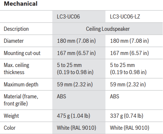 The LC3‑UC06 is a general purpose, cost-effective 6W ceiling loudspeaker, suitable for 100 V connection with power tapping of: 6, 3 and 1.5 Watt.