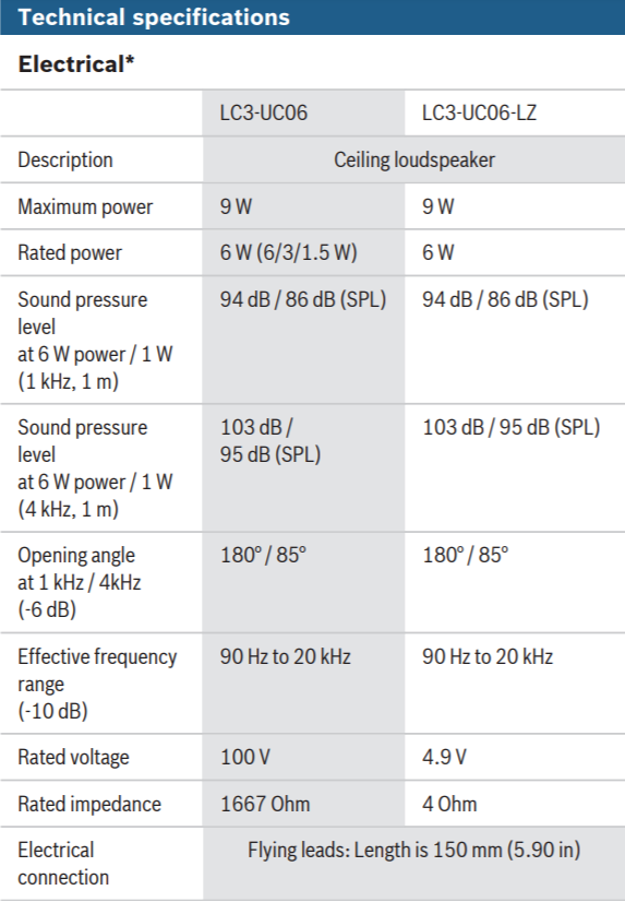 The LC3‑UC06‑LZ is a low impedance (4 Ohm) version ceiling loudspeaker for direct connection to a low impedance amplifier output.